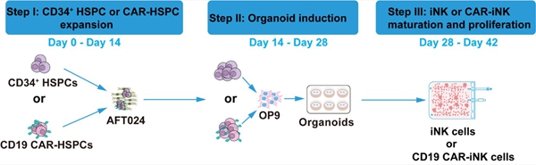 Overview of the method for large-scale production of iNK and CAR-iNK cells from cord blood CD34+ hematopoietic stem and progenitor cells. (Image by Prof. WANG's Lab)