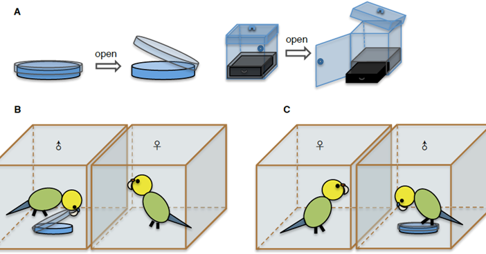 A: roblem-solving devices: the petri dish and the three-step box. B: he female observing a trained male opening the petri dish. C: focal female observing an untrained male trying unsuccessfully to open the dish. (Image by IOZ)
