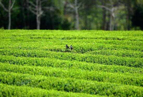 Two birds perch on tea plant at an ecological tea garden in Xingcun Township of Wuyishan City, southeast China's Fujian Province, March 26, 2019. (Xinhua/Wei Peiquan)