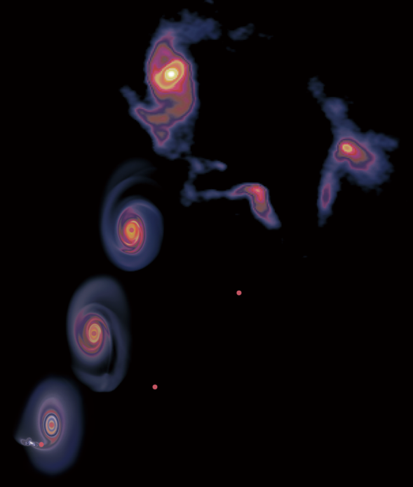 A schematic view of the history of the accretion disk and the intruding object. The three plots starting from the bottom left are snapshots from the numerical simulation, depicting the system at the time of the flyby event, 4000 years later, and 8000 years after that, respectively. The top right image is from the ALMA observations, showing the disk with spirals and two objects around it, corresponding to the system 12,000 years after the flyby event. (Image by SHAO)