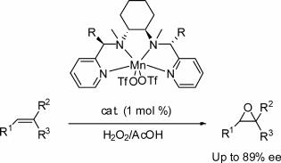 The asymmetric epoxidation of olefins is a very important organic transformation since the resulting enantiomerically pure epoxides are highly useful intermediates and building blocks. Many efforts have been dedicated to the development of chiral catalysts that can perform an asymmetric epoxidation reaction effectively. However, the chiral N4 manganese complexes previous research reported only exhibit low enantioselectivities. The present MnII complexes of chiral N4 ligands developed by our researchers are capable of achieving high enantiomeric excess in the catalytic asymmetric epoxidation. By comparison of [MnII(R,R-mcp)(CF3SO3)2] and new MnII complexes, it is clear that the size of the C7 and C7’ substituents is crucial to gain high asymmetric induction. To introduce proper groups on these positions will tune the steric bulk and electronic property of the ligands and result in significant improvement in enantioselectivity. The research indicates a conceptual strategy to improve the stereoselectivity of biologically inspired oxidation catalysis.
