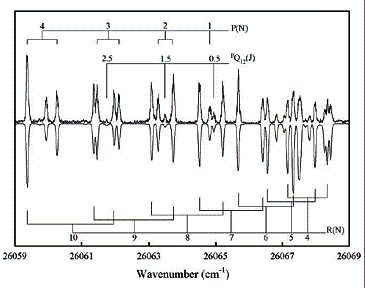 Fig. 2: A portion of the high resolution LIF spectrum of the B 2∑+ - X 2∑+ 0-0 band of As12C. The top trace is the experimental spectrum and the bottom trace is spectrum calculated from the constants obtained from the rotational analysis (Imaged by IMP).