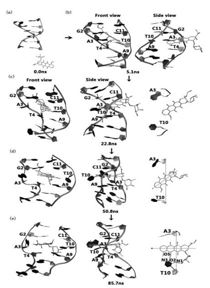 Recently a research team led by Prof. LEI Hongxing at Beijing Institute of Genomics (BIG), Chinese Academy of Sciences (CAS), analyzed the intercalation pathway of doxorubicin (an anticancer drug) to DNA fragments by performing molecular dynamics binding simulations, and proposed a new flipping-intercalation mechanism by which the insertion of the drug is directly coupled with a local base flipping after an outside binding.