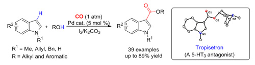 Researchers at the State Key Laboratory for Oxo Synthesis and Selective Oxidation, Lanzhou Institute of Chemical Physics (LICP), Chinese Academy of Sciences (CAS), have developed a novel strategy for the Pd-catalyzed direct carbonylation of various indoles in the presence of iodine and K2CO3 under 1 atm of CO to synthesize indole-3-carboxylates in moderate to excellent yields. This methodology showed good generality to indole, alcohol, and/or phenol with high regioselectivity. Furthermore, the catalytic procedure could be conveniently applied to the systematic synthesis of biologically active tropisetron from easily available starting materials. The work has been published in Org. Lett.(2012, 14, 4130- 4133).