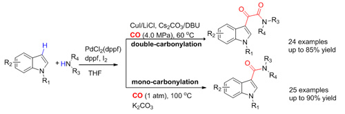 Intra-molecular direct aminocarbonylation with the presence of directing groups has been reported. However, the intermolecular aminocarbonylation of the aromatic C-H bonds has rarely been reported. Using the above strategy for oxidizing substrates, the researchers have developed a novel and efficient double-carbonylation of indoles with primary or secondary amines to yield indole-3-a-ketoamides and bioactive molecules could be one-pot synthesized using the method. The system could also be selectively switched to mono-carbonylation to afford indole-3-amides only by a slight modification of reaction conditions. The work has been published in Chem. Commun.(2012, 48, 11023-11025).