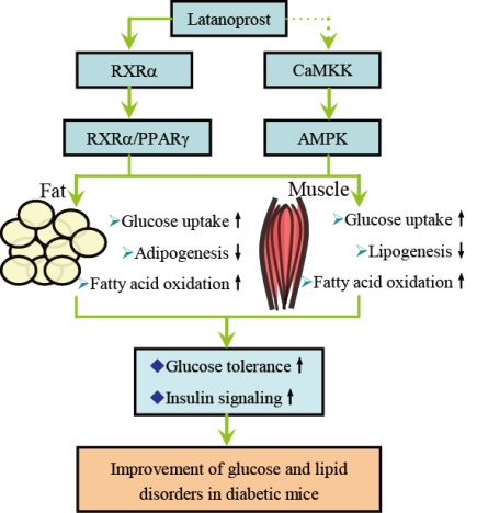 Through the inhibition of the transcription of RXRa/PPARg heterodimer and promotion of AMPK phosphorylation, Latanoprost effectively ameliorated glucose and lipid disorders in diabetic mice. (Image By SIMM)