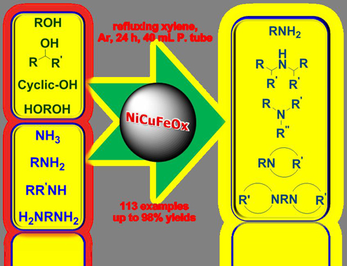 Researchers at R&D Center for Green Chemistry and Catalysis, Lanzhou Institute of Chemical Physics, Chinese Academy of Sciences (LICP), have designed and prepared a simple NiCuFeOx catalyst for the N-alkylation of ammonia or amines with alcohol. N-alkyl amines with various structures were synthesized in moderate to excellent yields in the absence of organic ligands and bases.