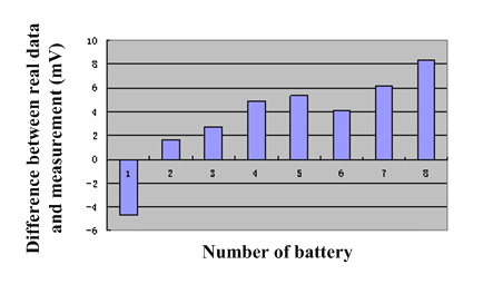 Fig.4 shows the voltage measurement error of eight cells (Maximum 0.21%, minimum 0.04%). An error of 2mV in voltage measurement means 1% error for the estimation of SoC(system on chip), so the results indicate that, in the worst situation, a 4% error of SoC estimation can be achieved, this is much less than the 10% demanded in real application. The chip and the system developed from it can be applied to the electric vehicles and tools, battery energy storage system.