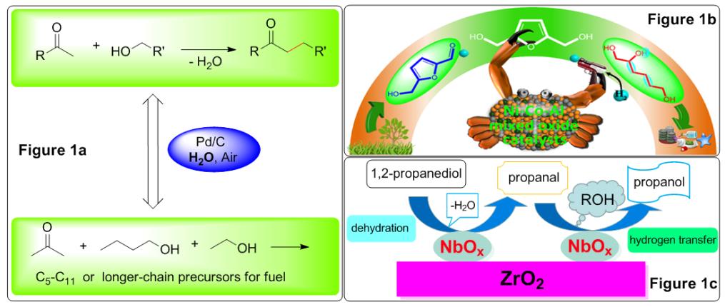 Figure 1. General schemes of direct α-alkylation of ketones with alcohols in water (Figure 1a), direct conversion of biomass-derived 5-hydroxymethylfurfural to 1,2,6-hexanetriol (Figure 1b), formation of propanol from 1,2-propanediol via dehydration and consecutive hydrogen transfer (Figure 1c). (Image by Professor MU’s group)
