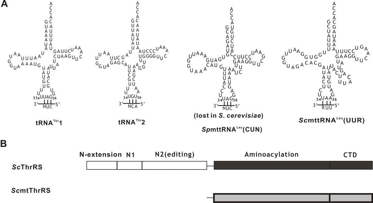 Figure. Representations of tRNAs and S. cerevisiae ThrRSs investigated in this study. (A) Cloverleaf structures of S. cerevisiae mitochondrial tRNAThr1, tRNAThr2, tRNALeu(UUR) [ScmttRNALeu(UUR)] and S. pombe mitochondrial tRNALeu(CUN) [SpmttRNALeu(CUN)], which has been lost in S. cerevisiae mitochondria during evolution. (B) Linear representation of the domain arrangement of SccytThrRS and ScmtThrRS. Aminoacylation domain and C-terminal tRNA binding domain (CTD) of SccytThrRS or ScmtThrRS are colored in black or gray, respectively. (Image by Prof. WANG Enduo`s group)