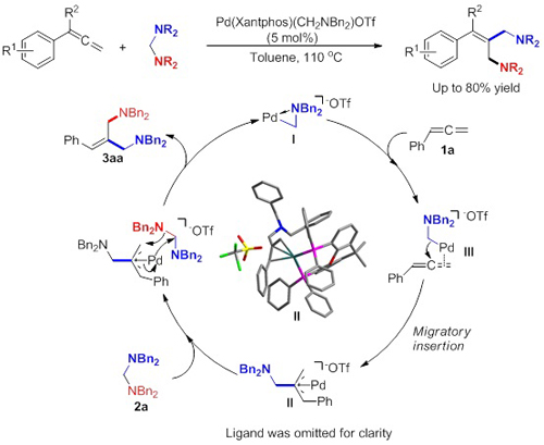 They have developed the first direct insertion of an allene into an aminal C-N bond to provide 1,3-diamines through a palladium-catalyzed C-N bond activation. A unique cyclometalated PdII complex has been identified as an efficient catalyst for this reaction.