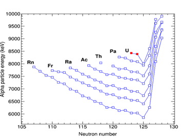 Fig.1 α-particle energies of ground state to ground state transitions for neutron-deficient Rn, Fr, Ra, Ac, Th, Pa and U isotopes (except 209Th). Open squares refer to literature values. The red solid squares refer to the values of 216U and 215U measured in this work. Although one α-particle energy if 8.005(20) MeV for the a decay of 217U has been reported in reference and this value has been plotted in this figure, it may not be the α-particle energy of the ground state to ground state transition for 217U, due to its significant deviation from this systematic regularities. However, this assumption needs to be confirmed by further experiments. (Image by IMP)
