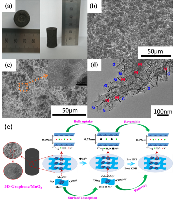(a) Photographs of 3D graphene aerogels; (b) SEM image of 3D graphene aerogels; (c) SEM images of graphene/MnO2; (d) TEM image of the graphene/MnO2 (graphene sheets are marked in blue G and MnO2 sheets are marked in red M); (e) Schematic illustration of the preparation process of 3D graphene/MnO2 aerogels (Image by ZHOU Hongjian)