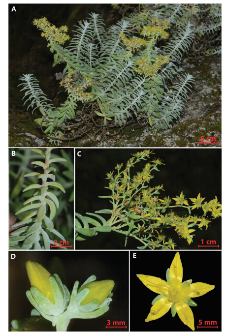 Figure: Sedum keniense. A.Habitat; B. stem and leaves; C. inflorescences; D. bracts, sepals and flower buds; E. flower. Voucher: SAJIT 002822 (HIB). (Image by Y.D. Zhou.)
