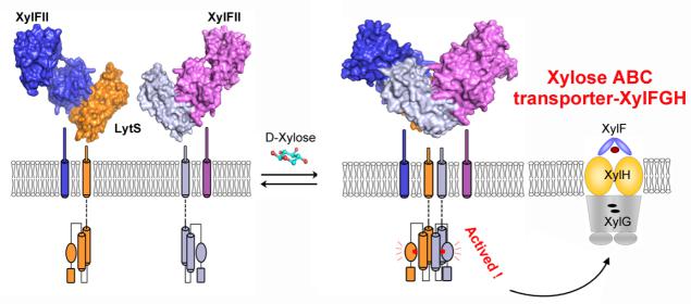 In 2015, a membrane two-component complex was identified in Firmicutes bacteria, comprising a membrane-associated sensor protein (XylFII), a transmembrane histidine kinase (LytS) for periplasmic d-xylose sensing, and a cytoplasmic response regulator (YesN) that activates the transcription of the target ABC transporter XylFGH genes to promote the uptake of d-xylose. However, the molecular mechanism underlying signal perception and integration of these processes remains unclear.