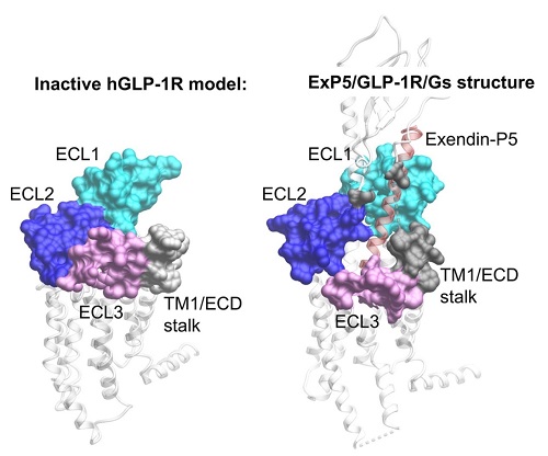 Inactive glucagon-like peptide-1 receptor model and active structure activated by Exendin-P5 in complex with Gs protein (Image by The Journal of Biological Chemistry)