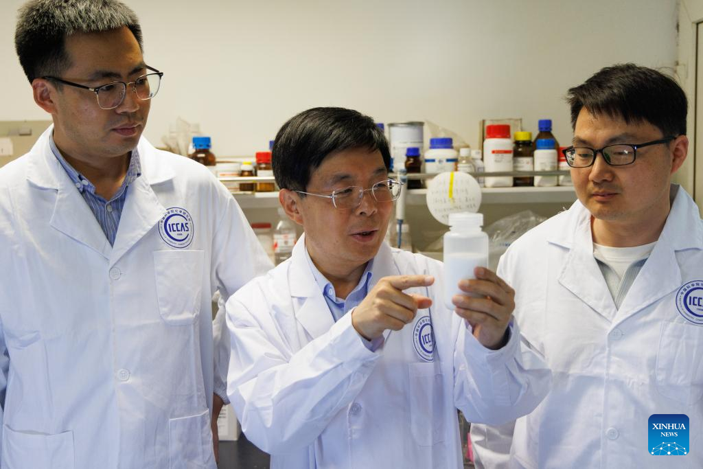 Researcher Song Yanlin (C), associate researcher Li Huizeng (L) and Doctor Li Kaixuan communicate at the laboratory of the Institute of Chemistry, Chinese Academy of Sciences (ICCAS), in Beijing, capital of China, April 20, 2026. (Xinhua/Jin Liwang)
