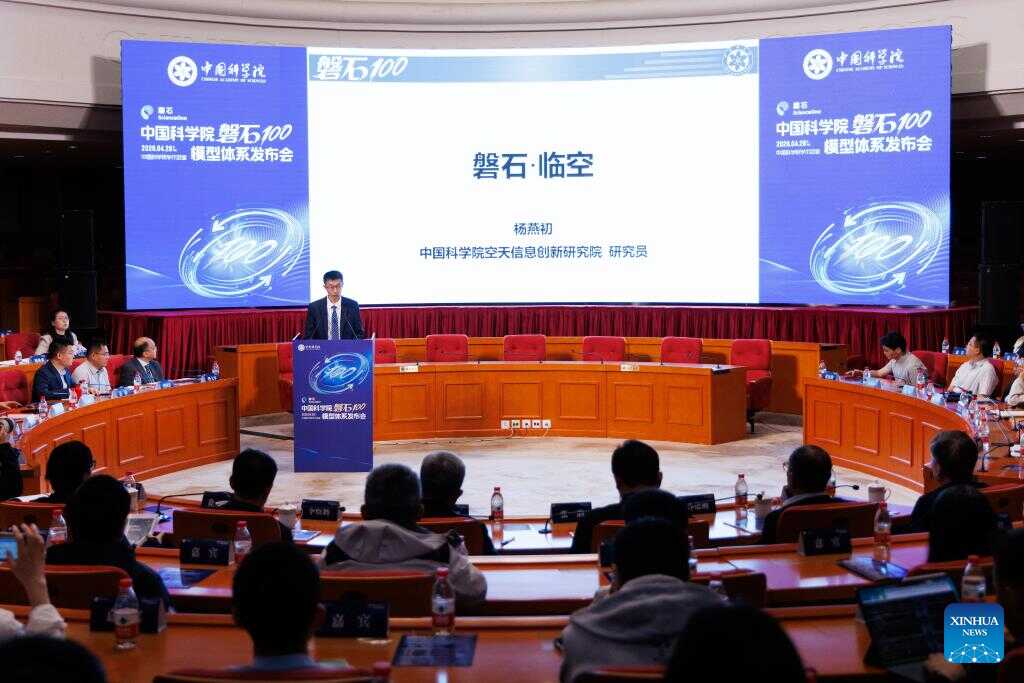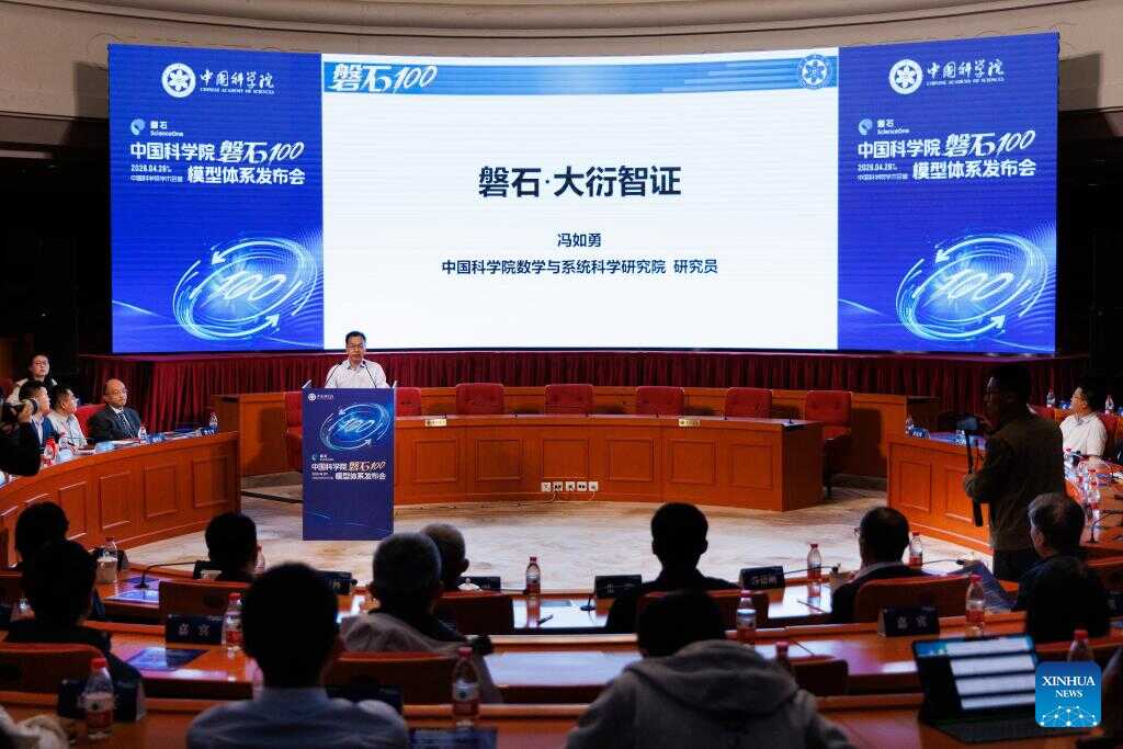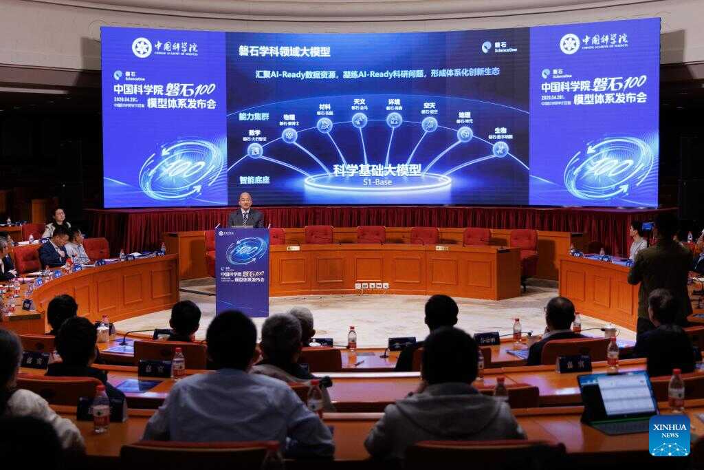 This photo taken on April 28, 2026 shows a scene at the launching ceremony of ScienceOne 100, an artificial intelligence (AI) model system by the Chinese Academy of Sciences, in Beijing, capital of China. (Xinhua/Jin Liwang)