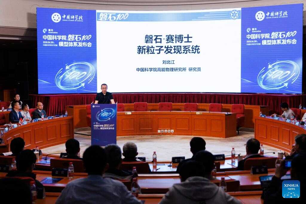 Researcher Liu Beijiang at the Institute of High Energy Physics of the Chinese Academy of Sciences (CAS) reveals an AI model in Beijing, capital of China, April 28, 2026. (Xinhua/Jin Liwang)