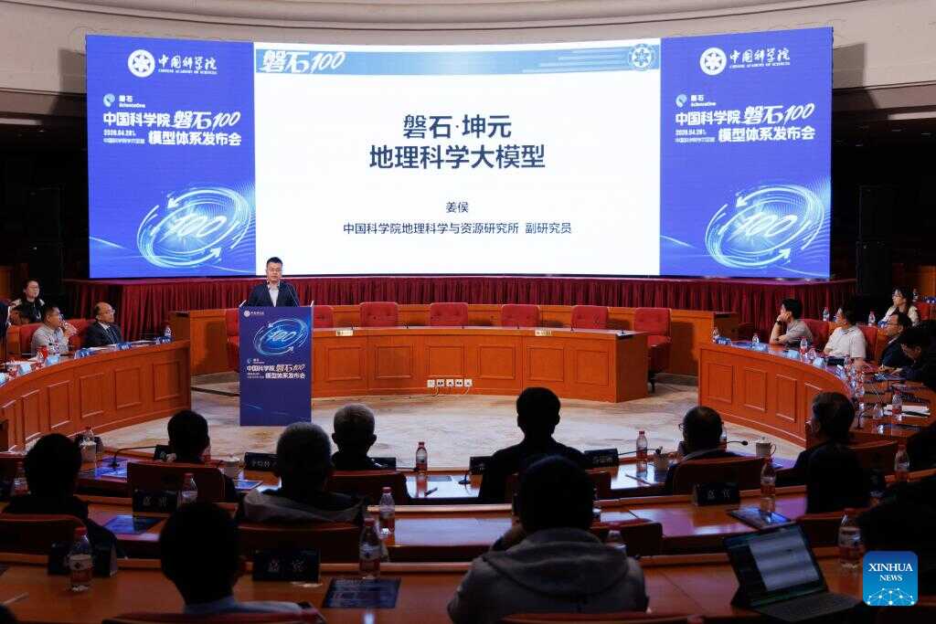Associate researcher Jiang Hou at the Institute of Geographic Sciences and Natural Resources Research of the Chinese Academy of Sciences (CAS) reveals an AI model in Beijing, capital of China, April 28, 2026. (Xinhua/Jin Liwang)
