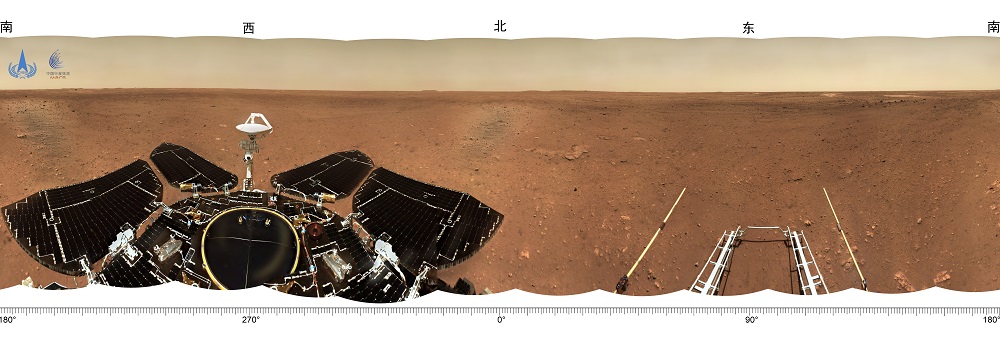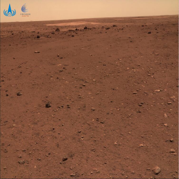 Three pictures were taken by Zhurong's cameras, and displayed the rover's upper stage, its landing platform and the environment of the landing site. Another one was shot by a separate camera deployed by Zhurong on Martian soil, showing the rover and the landing platform together.