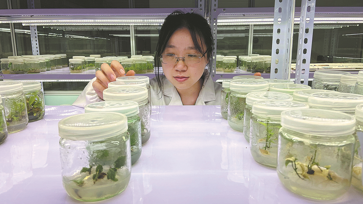 A researcher with the Kunming Institute of Botany in Yunnan checks rare seedlings. [YANG WANG LI/CHINA DAILY]