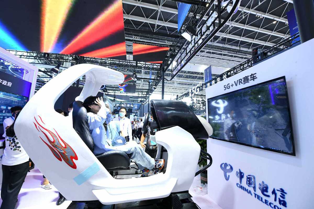 A visitor experiences a 5G+VR racing cockpit at the China International Digital Economy Expo 2021 in Shijiazhuang, North China's Hebei province, Sept 7, 2021. [Photo/Xinhua]