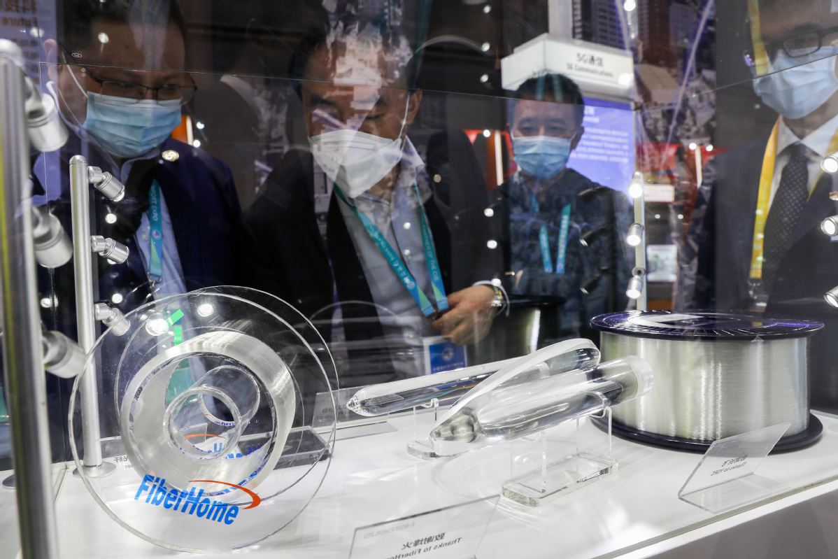 Visitors observe a 3-meter-long stick made of optical fiber raw quartz material produced by Heraeus at the third China International Import Expo. [Photo/China News Service]
