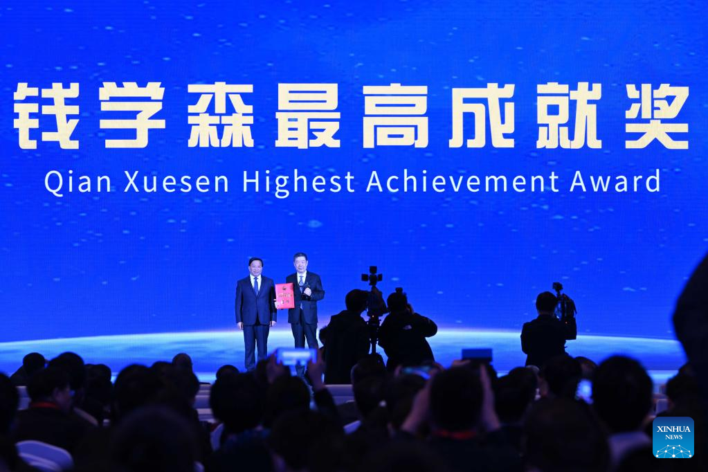 Zhou Jianping, an academician of the Chinese Academy of Engineering and the chief designer of China's manned space program, is awarded the Qian Xuesen Highest Achievement Award in Hefei, east China's Anhui Province, April 24, 2023. China celebrated its Space Day this year on Monday with a series of activities and events.