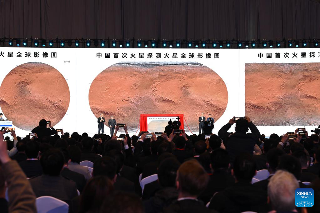 The China National Space Administration and the Chinese Academy of Sciences jointly release a series of global color images of Mars obtained from the country's first Mars exploration mission at the launch ceremony of the Space Day of China in Hefei, east China's Anhui Province, April 24, 2023. China celebrated its Space Day this year on Monday with a series of activities and events.