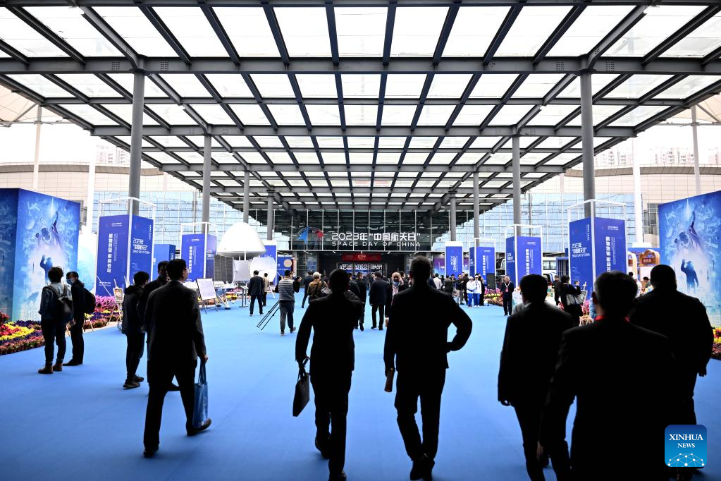 About 1,200 guests from over 40 countries are invited to participate in this year's Space Day of China, which includes a series of activities such as the China Space Conference, the International Deep Space Exploration Conference, and the China Space Culture and Art Forum. (Xinhua/Du Yu)