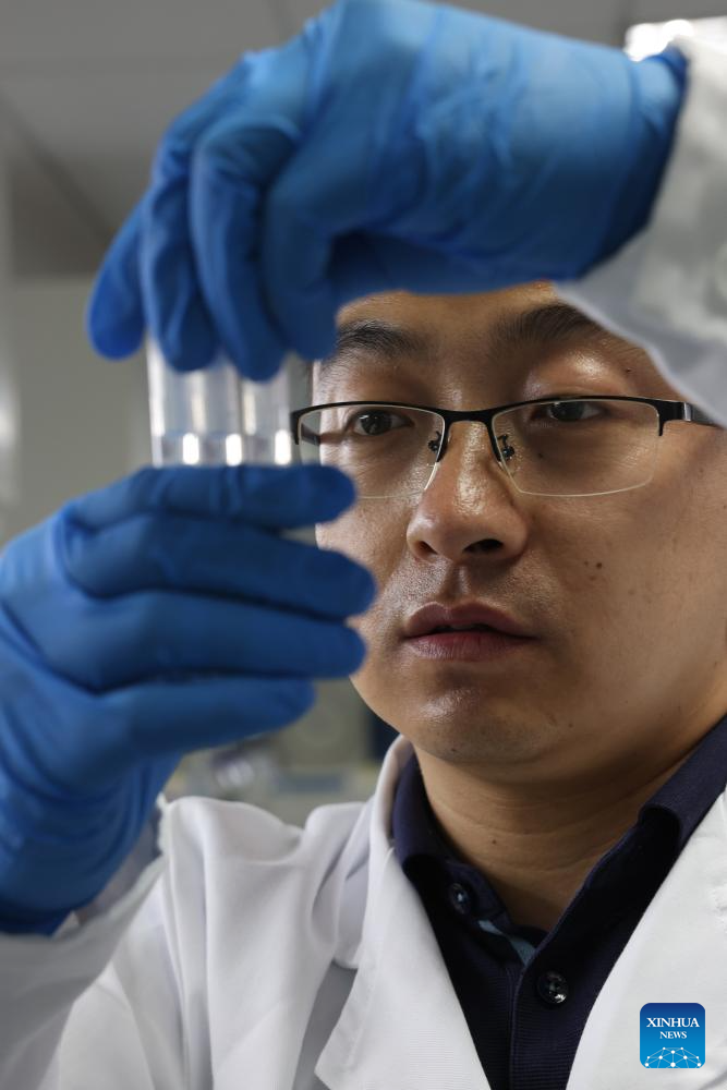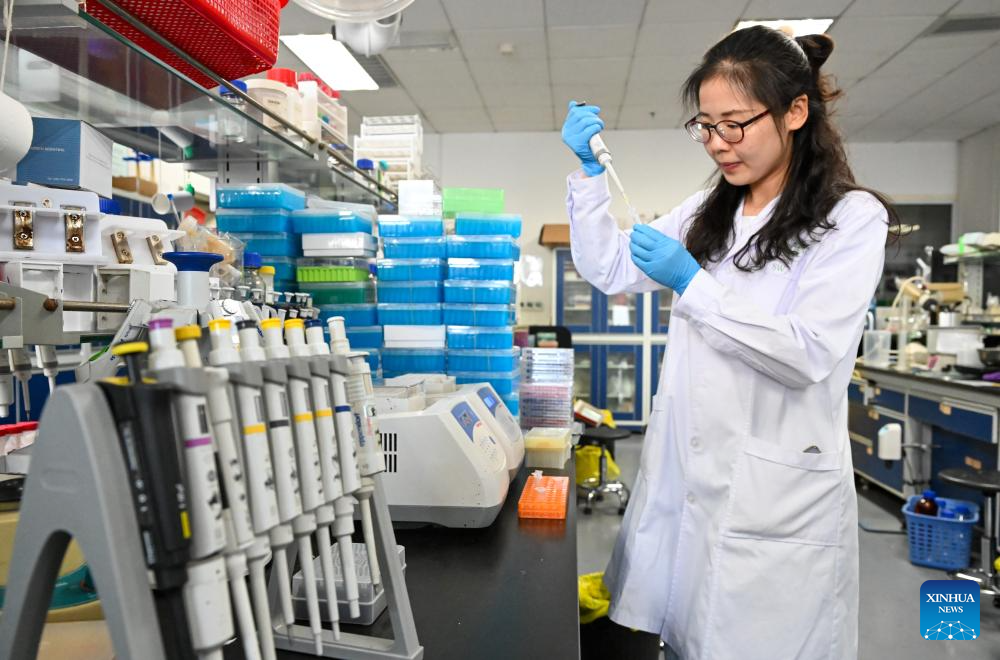 Dr. Song Wan carries out an experiment at a laboratory of the Tianjin Institute of Industrial Biotechnology under the Chinese Academy of Sciences in Tianjin, north China, Aug. 13, 2023. Chinese scientists have developed an artificial method of synthesizing hexoses from carbon dioxide (CO2) in a laboratory environment -- a key step in the global development of synthetic sugar. (Xinhua/Sun Fanyue)