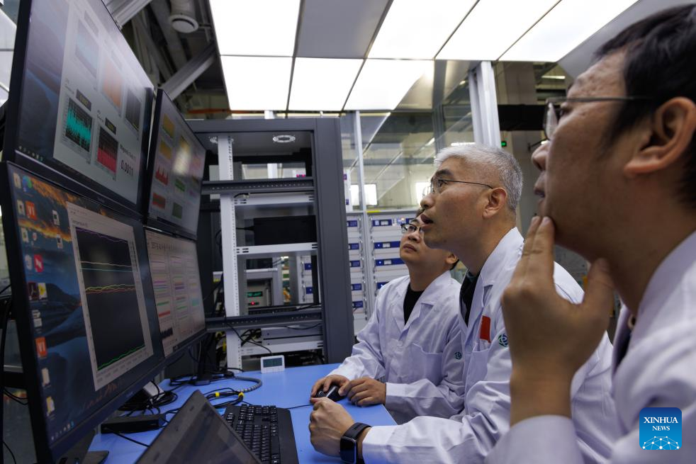 Researchers Li Gang, Liu Jianghua, and Zhou Benzhe (R-L) discuss the operational status of the all-superconducting magnet at the ultra-low temperature high magnetic field quantum oscillation experimental station of the Institute of Physics of the Chinese Academy of Sciences in Beijing, capital of China, on Jan. 26, 2026. (Xinhua/Jin Liwang)