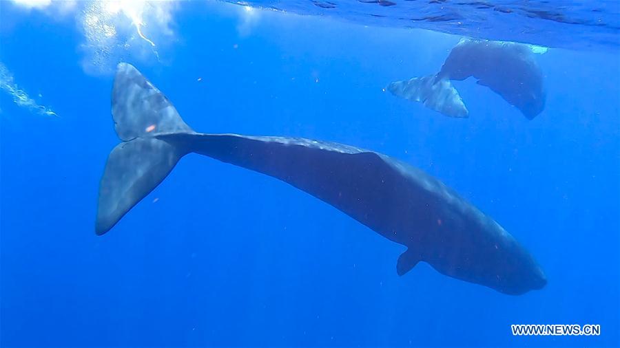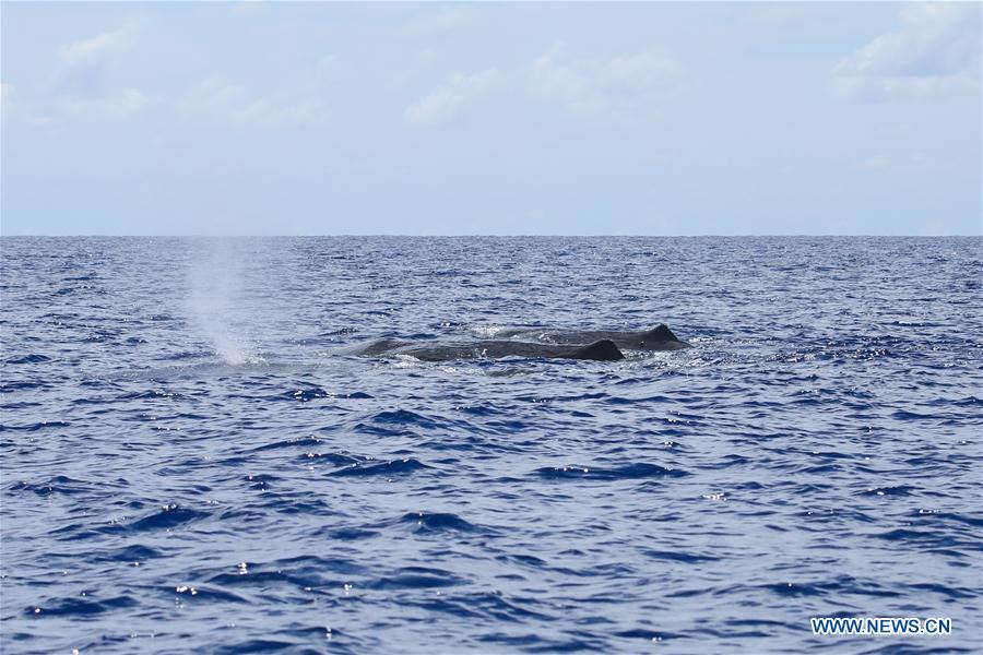 Photo taken on July 24, 2020 shows sperm whales in the South China Sea. Chinese researchers have spotted 11 whale species in the South China Sea during a deep-sea scientific expedition, the Chinese Academy of Sciences said Tuesday. (Xinhua/Zhang Liyun)