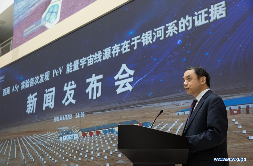 Wang Yifang, a Chinese Academy of Sciences (CAS) academician, speaks during a news conference in Beijing, capital of China, April 2, 2021. The Tibet ASgamma experiment, a China-Japan joint research project, has detected that a supernova remnant may be the source of some ultrahigh-energy cosmic rays. Cosmic rays are high-energy particles that move through space at nearly the speed of light. It is believed that particles could be accelerated in PeVatron and reach a petaelectron volt (PeV), which creates 100 times more energy than the record high achieved by any human-made accelerator on Earth. Scientists have been trying to find these cosmic accelerators, hoping they could provide clues about how stars evolve and how energy is transported throughout the galaxy. No PeVatrons have been firmly detected yet. On Tuesday, a team of scientists from China and Japan reported in Nature Astronomy that they had identified supernova remnant SNR G106.3+2.7 as a potential PeVatron in our galaxy from the China-Japan Tibet ASgamma experiment. (Xinhua/Jin Liwang)