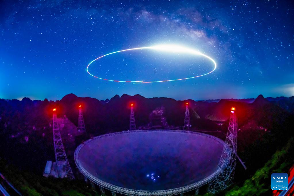 The long-time exposure photo taken with a fisheye lens on July 24, 2022 shows a night view of China's Five-hundred-meter Aperture Spherical Radio Telescope (FAST) under maintenance in southwest China's Guizhou Province.