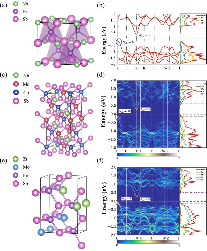 Fig. 1. Crystal structures (a: NbFeSb, c: Nb4Mn2Co2Sb4, e: Zr2Mo2Fe4Sb4), their corresponding band structures and density of states (b, d, f). (Image by TI Zhuoyang)