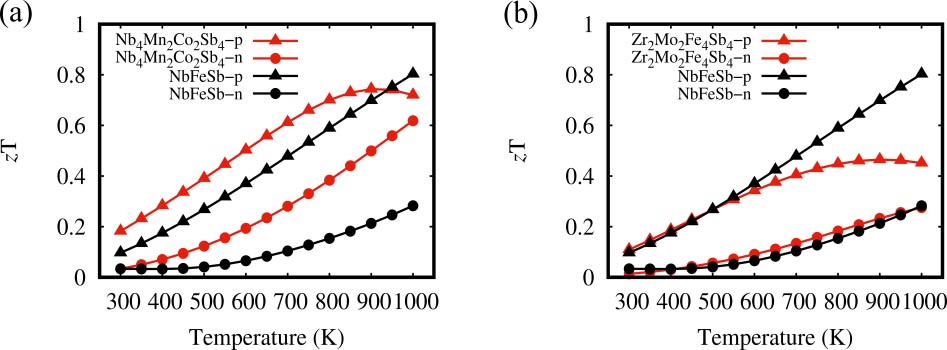 In this scheme, the p- and n-type (negative electron) zT values of Nb4Mn2Co2Sb4 are predicted to reach to 0.72 and 0.62 at 1,000 K, higher than those in the pristine NbFeSb compound.