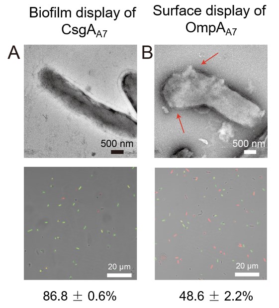 To demonstrate the resistance of biofilms, researchers constructed another strain to display A7 peptides on cell membranes, which enabled mineralization of CdS NPs on cell membranes. The photocatalyst-mineralized bacterial cells were used as controls. After irradiation for 24 hours, the cells in photocatalyst-mineralized biofilms were almost integral, while the controls exhibited partial damage or even fractures.