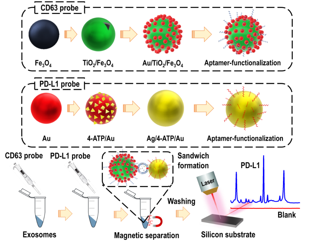 By making it "sandwich", they captured the malignant exosomes between magnetic nanocomposites and SERS nanotags with which they could quantitatively measure the PD-L1 biomarker by analyzing the Raman report signals.