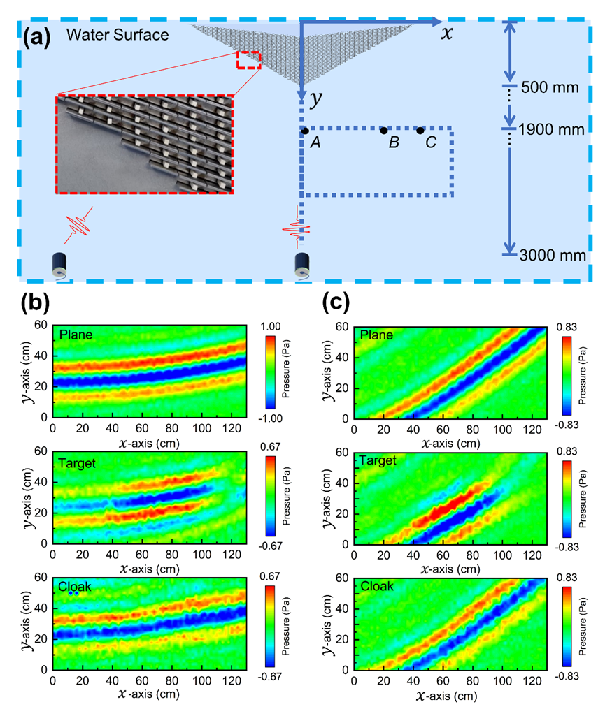 By periodically embedding the syntactic foam and steel rods in water, they designed and prepared a two-dimensional underwater acoustic carpet cloak. The experiment demonstration was conducted in an anechoic water tank. Experimental results indicated that the designed carpet cloak worked well under both normal and oblique incidences with broadband frequencies.