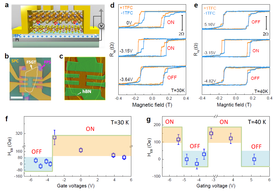a. Schematic of the solid proton field effect transistor; b, c. Optical and atomic force microscope images of heterostructure device; d, e. Gate-dependent exchange bias effects at T = 30 and 40 K, respectively; f, g. Amplitudes of the exchange bias effects under various gating voltages at T = 30 and 40 K, respectively. (Image by ZHENG Guolin)