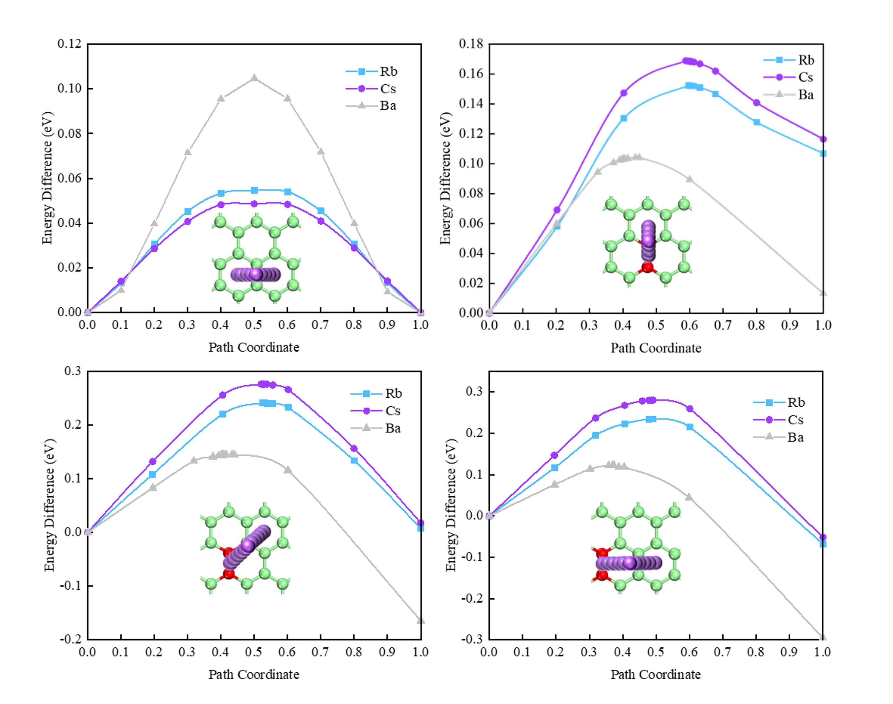 Fig. 2. Migration behavior of alkali and alkaline earth metal atoms on pristine and oxygen-containing defective graphene surfaces. (Image by ZHAO Ming)