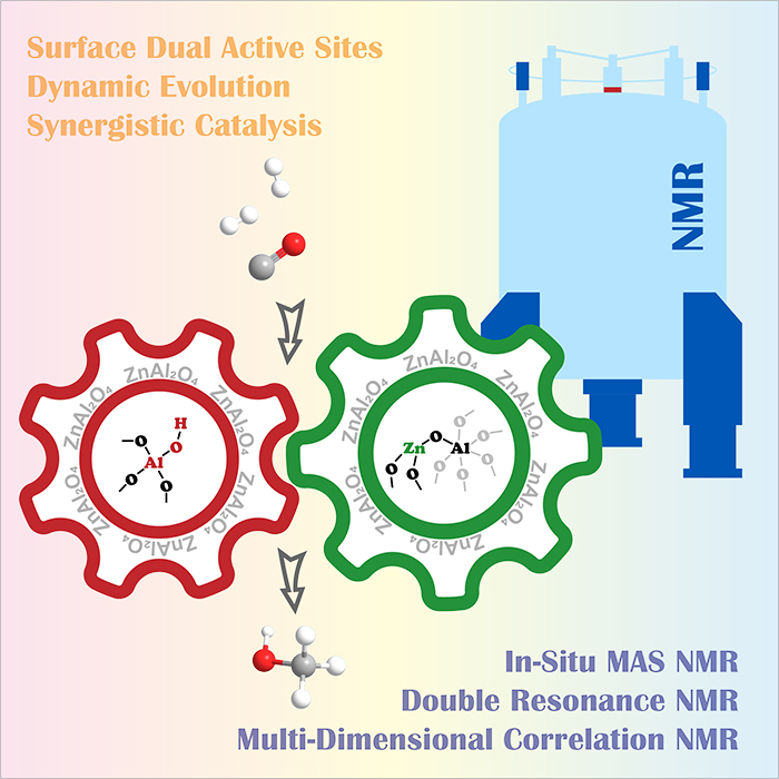 Revealing the synergistic interplay of dual active sites on a spinel ZnAl2O4 bimetallic oxide for syngas conversion by state-of-the-art solid-state NMR technologies (Image by HAN Qiao and GAO Pan)