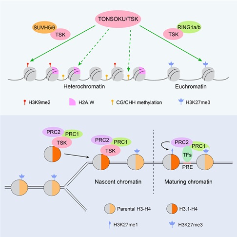 In addition, TSK physically associates with the H3K9 methyltransferases SUVH5 and SUVH6, as well as the Polycomb proteins RING1a and RING1b, implying that TSK may recruit them to nascent chromatin to restore chromatin modifications.