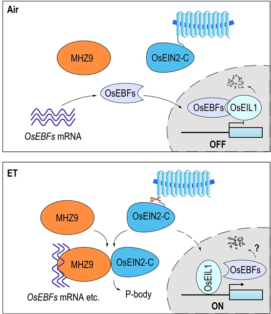 They found that MHZ9 is localizes to the RNA processing body (P-body). Biochemical studies further revealed that the C-terminus and N-terminus of MHZ9 play different roles. The MHZ9 C-terminus contains a glutamine-rich segment that mediates the interaction between MHZ9 and OsEIN2-C and is also sufficient and necessary for the P-body localization of MHZ9. The MHZ9 N-terminus contains a predicted domain for RNA splicing/modification, and binds directly to OsEBF1/2 and many other mRNAs.