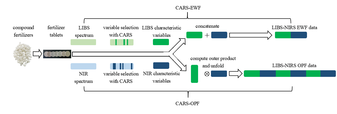 They used 168 compound fertilizer samples as test objects to analyze the LIBS-NIRS data under different optimization conditions and methods. And found that the LIBS-NIRS data fusion model based on competitive adaptive reweighted sampling combined with outer product fusion (CARS-OPF) and competitive adaptive reweighted sampling combined with equal weight fusion (CARS-EWF) have better quantitative analysis performances than the single spectroscopic methods.