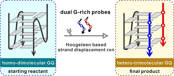 Figure 1. Schematic illustration of the spontaneous Hoogsteen pairing-based strand displacement reaction between one homo-dimolecular GQ target and dual G-rich invading probes at room temperature, yielding the final product of heteromeric trimolecular GQ. (Image by ZHANG Na)