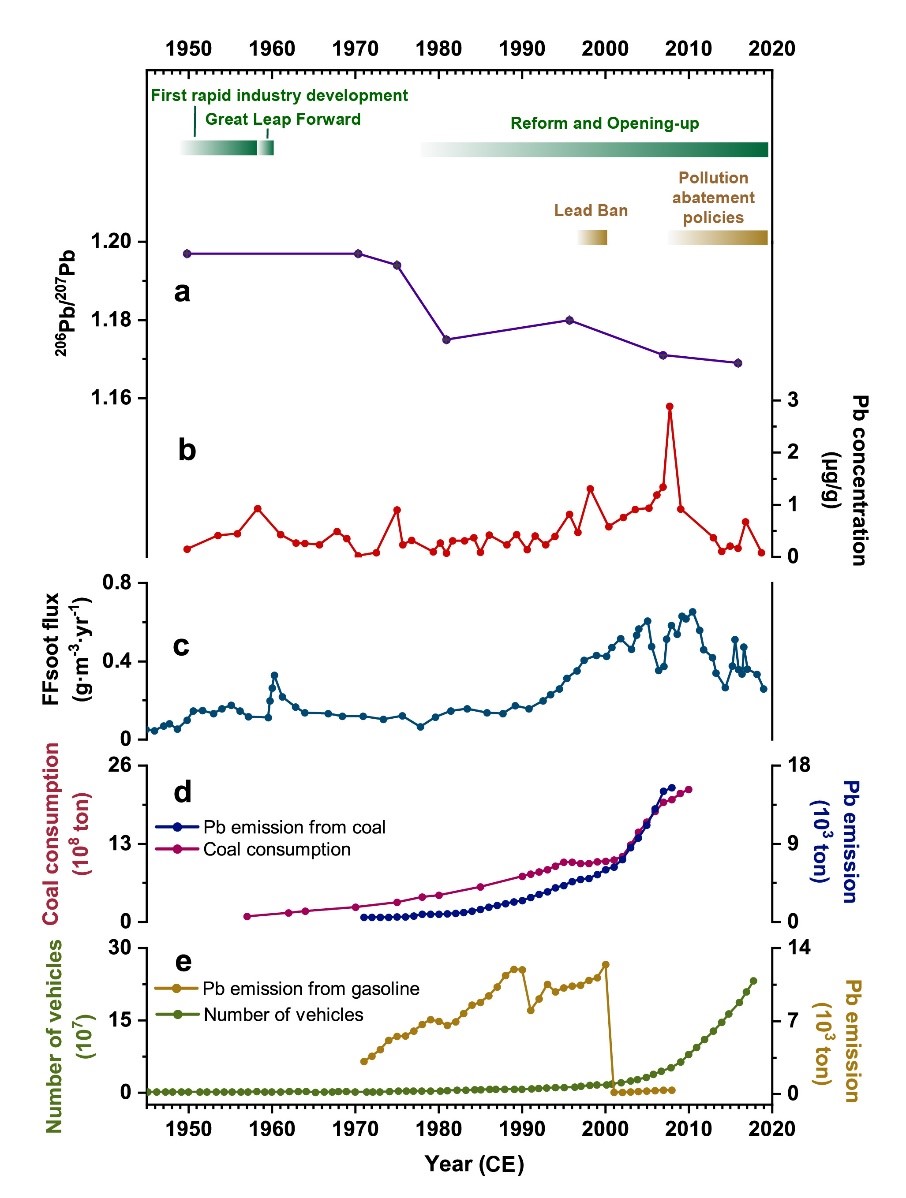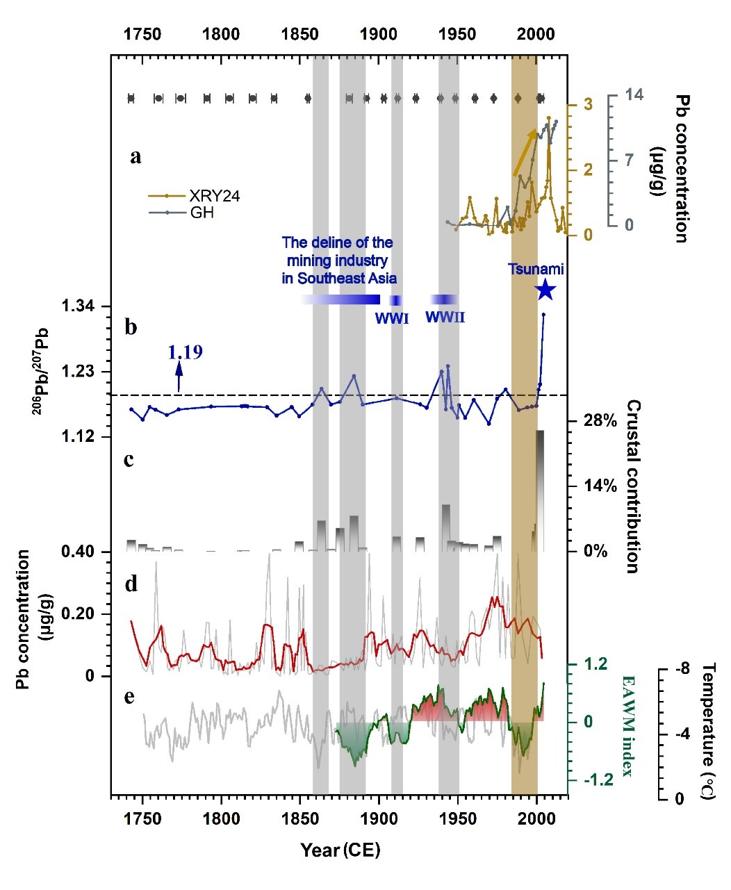 Moreover, the long-range transport of Pb pollutants was influenced by the strength of the East Asian Winter Monsoon (EAWM), with high (low) amount of Pb pollutants transported from the upwind areas to the study area during the strong (weak) EAWM before 1980 AD. However, it was more influenced by regional industrial Pb emissions after 1980 AD.