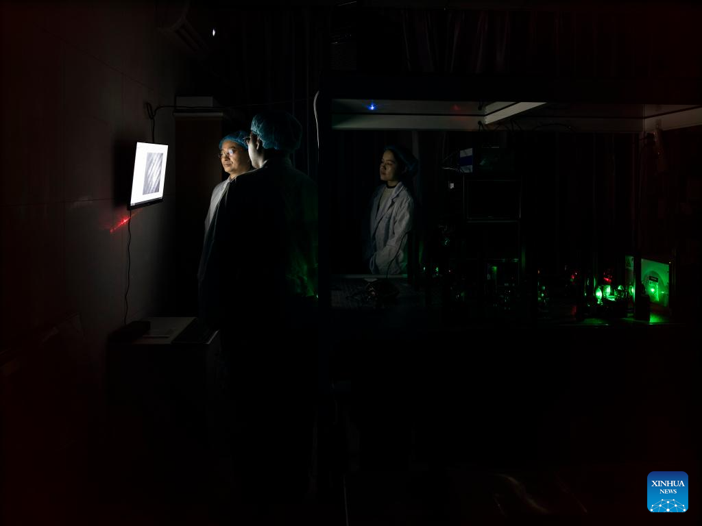 Researchers perform an experiment at a laboratory in the Shanghai Institute of Optics and Fine Mechanics, Chinese Academy of Sciences in east China's Shanghai, Feb. 29, 2024. (Xinhua/Fang Zhe)